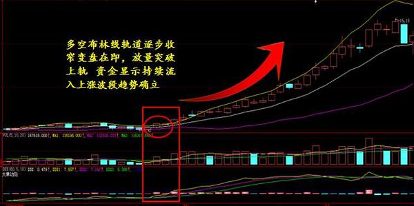 第四:爆发前BOLL三线粘合越紧密,后市爆发幅度越剧烈。