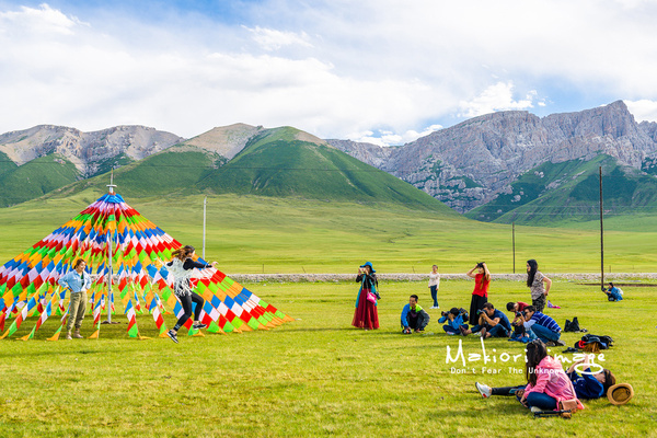 天峻山下面就是一望无际的天峻草原,在这里有不少藏民在此生活顺便接待游客。天色还早,我和我的小伙伴们就在此拍照嬉戏。高原的宽旷真的能让人从压抑的城市生活中解放出来,尽情的抒发自己的情怀和展现自己。