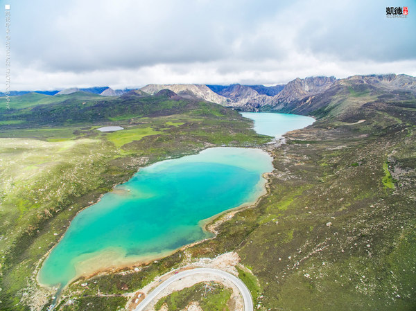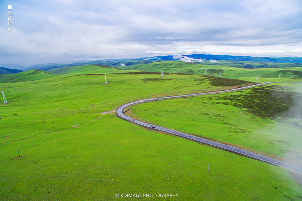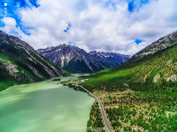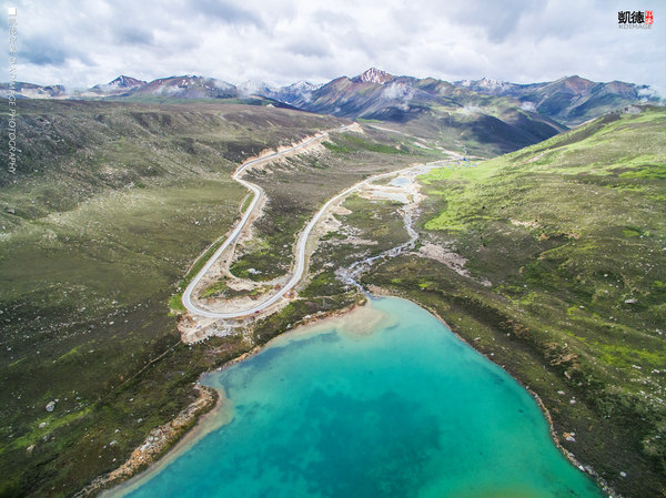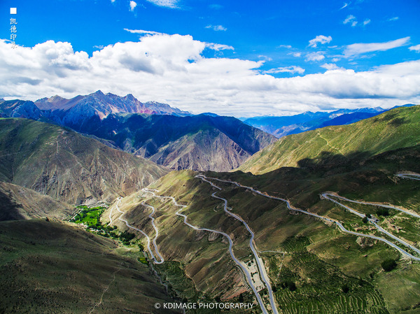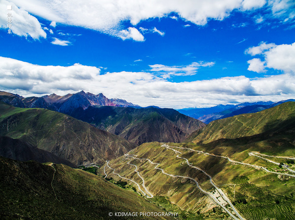 经幡飘扬在这个 五千多米的山口,周围是连绵的山脉还有雪山。垭口的风很大,气温低了很多,在这里连走路都会气喘吁吁。我们在这个海拔放飞无人机,第一次挑战这么高的海拔,还是有点胆战心惊的,幸好还是安全返航。广阔的绿色草甸和延绵的318国道看着让人心情舒畅。