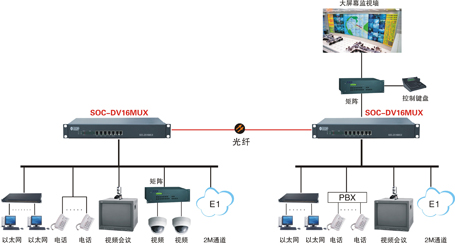 HG-DV16MUX多业务视频光传输平台是华光高科电子有限公司根据市场需求,适时开发出基于视频传输的多业务光传输平台,采用国际最先进的数码视频高速传输技术,将同时把16路视频,16路音频,2路E1接口,4路数据(RS485/RS422/RS232/),8路开关量、8路电话(FXS /FSO/EM/载波/磁石,最多克扩60路电话)、多路10M/100M/1000M以太网等等接口在单芯或双芯光纤上无失真、高质量传输。SOC- DV16MUX多业务视频光传输平台采用全数字无压缩技术,因此能支持任何高分辨率运动、静止图像无失真传输;克服了常规的模拟调频、调相、调幅光端机多路信号同传时交调干扰严重、容易受环境干扰影响、传输质量低劣、长期工作稳定性差等致命缺点。并可同时提供多路视频、音频、数据、电话语音、以太网在光纤上同时传输,大大节省了用户设备投资成本,提高了光缆利用率。系统采用结构化、模块化设计,采用~220V和-48V同时供电,可接蓄电池,保证设备不间断可靠的运行,并可纳入网管系统,具有完善的网管功能。用户可根据现场具体情况灵活选择或定制配置。