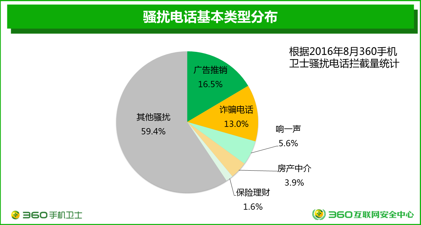 仅2016年8月,360手机卫士就为全国用户拦截各类骚扰电话34.3亿次,平均每天拦截骚扰电话约1.11亿次。其中,共拦截诈骗电话4.45亿次,占到了当月骚扰电话拦截总量的13.0%,平均每天拦截诈骗电话约1435万次。考虑到诈骗电话可能给用户带来的经济损失和其他严重后果,诈骗电话显然已经成为危害最为严重的骚扰电话类型。