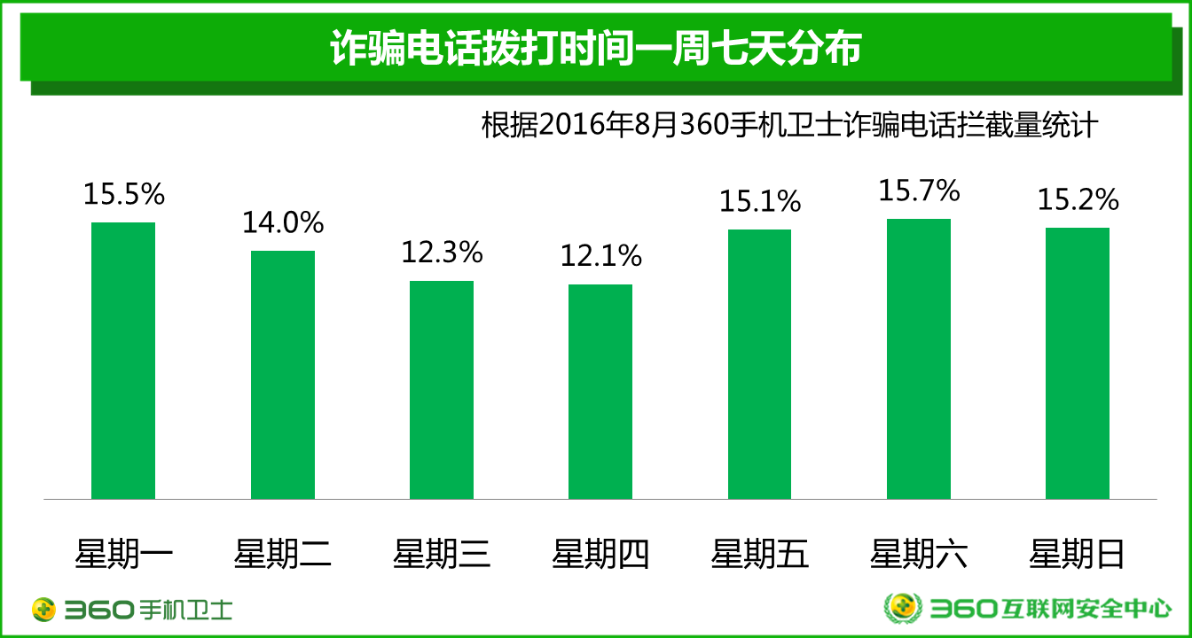 根据2016年8月360手机卫士拦截诈骗电话情况的抽样分析显示:每周五到下一周的周一,每天诈骗电话呼叫量均超过了一周总量的15%,而周二到周四的呼叫量则相对较低。报告认为造成这种情况的主要原因在于,周末很多人都会独自在家,有空闲时间,而且身边没有可以给自己提醒的人,被骗子成功诈骗的几率也就更高。骗子们也因此选择在周末来拨打更多的诈骗电话。