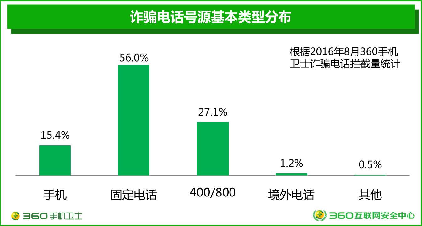 根据2016年8月360手机卫士拦截诈骗电话情况的抽样分析显示:在诈骗电话的号码源中,固定电话呼出的诈骗电话数量最多,占所有诈骗电话呼叫量的56.0%;其次是400/800电话,占比为27.1%;手机呼出的诈骗电话占诈骗电话呼叫总量的15.4%;此外,还有1.2%的诈骗电话来自境外呼入。可见,固定电话和400/800号码更应该成为诈骗电话治理的重点对象。
