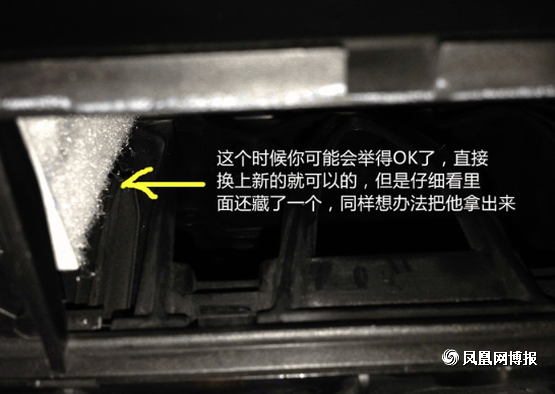 接下来我们再来拆接外部的空调滤芯, 黄色标出的地方就是机关所在,圆圈的部分就只要用手指一捏就可以松掉提起,箭头部分是拔出来后的样子,所以童鞋们不用担心用力一拔就可以了。